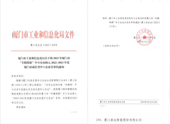 2022年9月16日,根據(jù)《廈門市成長(zhǎng)型中小企業(yè)認(rèn)定管理暫行辦法》(廈工信規(guī)〔2021〕2號(hào))第七條規(guī)定:“當(dāng)年認(rèn)定的市級(jí)‘專精特’中小企業(yè)可直接認(rèn)定為成長(zhǎng)型中小企業(yè)”,廈門市工業(yè)和信息化局公布了“2022-2023年度廈門市成長(zhǎng)型中小企業(yè)”名單,廈門鼎運(yùn)智能股份有限公司榮列其中。